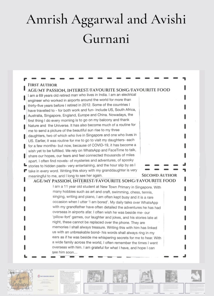 Live a Legacy is a project by PAP, in which one senior teams up with one teenager to write a book, about their life journeys and experiences, about the challenges they had to face, and the friends they made along the way. Some people decided to embark on this journey with someone they had never met before, I decided to embark on this journey with my grandfather, my nanu. This experience allowed me to not only bond and spend more time with my grandfather, but also allowed me to traverse down memory lane with him.